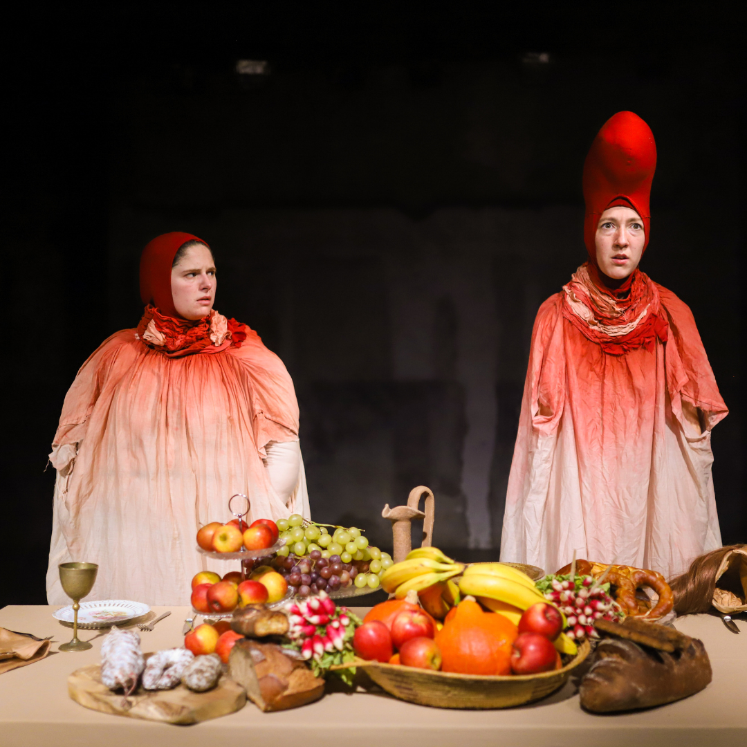 Cloîtrées dans une maison, Thérèse et Palmier répètent inlassablement les mêmes rituels. Chaque jour, elles veillent à être parfaites, sous peine d’être découpées en morceaux. Une nuit, leurs corps se rebiffent : Palmier est en proie à des pensées érotiques et Thérèse rêve de délicieux festins. La mécanique journalière si bien huilée déraille. C’est l’histoire d’une complicité qui se fraye un chemin dans une compétition acharnée, dans une fable politique qui s’empare du bouffon, pour explorer au plateau la violence des injonctions féminines, par un comique grotesque, qui nous console et nous libère.