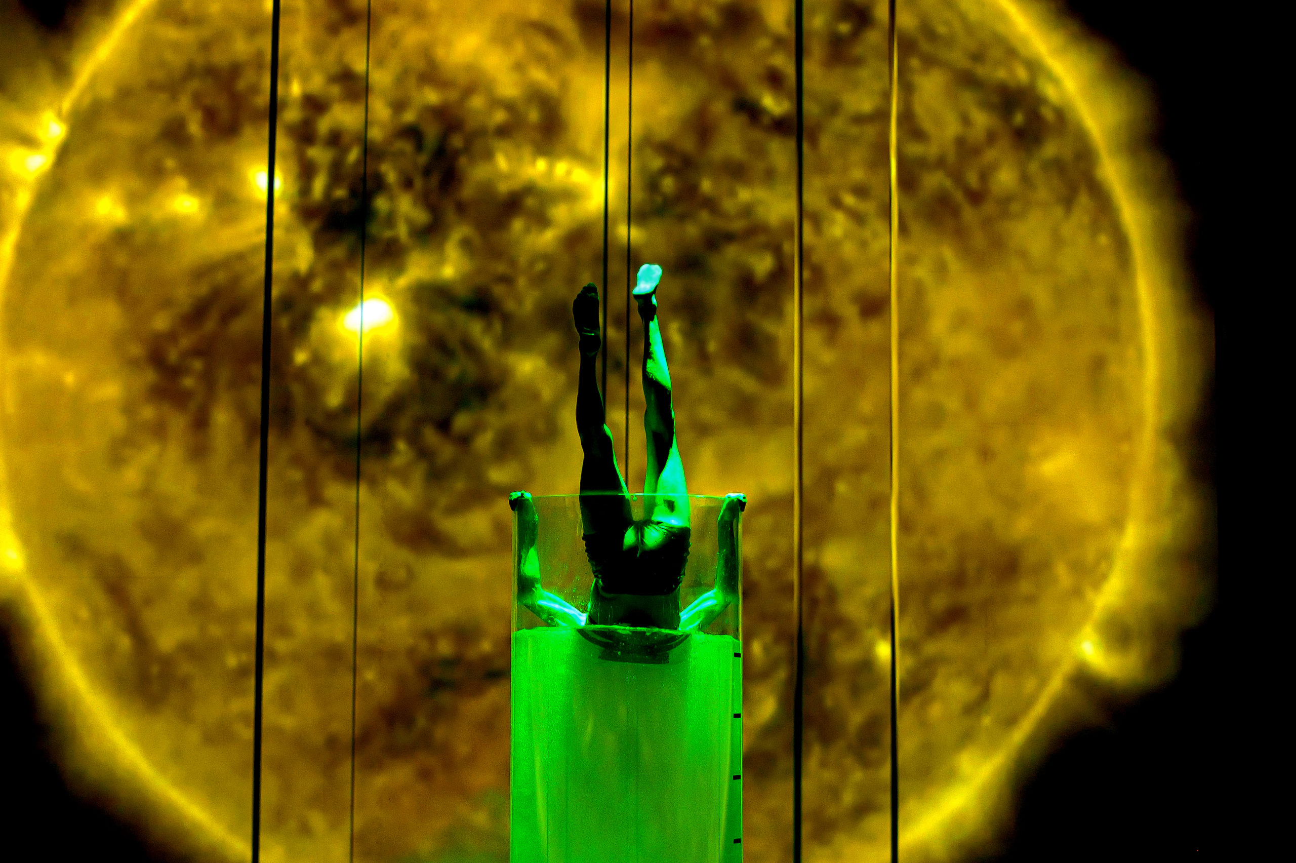 Dans cette performance, à la frontière de la science et de l’art, il oscille entre sa course et sa mémoire, explorant le flux de son souffle et le rythme qu’il engendre dans son corps. Sur le plateau, coincé dans un grand tube à essai, ce drôle d’individu se livre à une expérience dont il semble être à la fois le cobaye et l’examinateur. Tandis que des mots jaillissent spontanément de sa bouche, il se met à courir sur place comme pour activer tout son système physiologique. Sa respiration croissante, les bruits de son corps et sa voix sont repris par deux artistes sonores qui les façonnent en direct. Son cosmos intérieur se dévoile alors sur un écran en un déluge d’images délirantes où science et imaginaire se rejoignent dans une démesure jubilatoire.