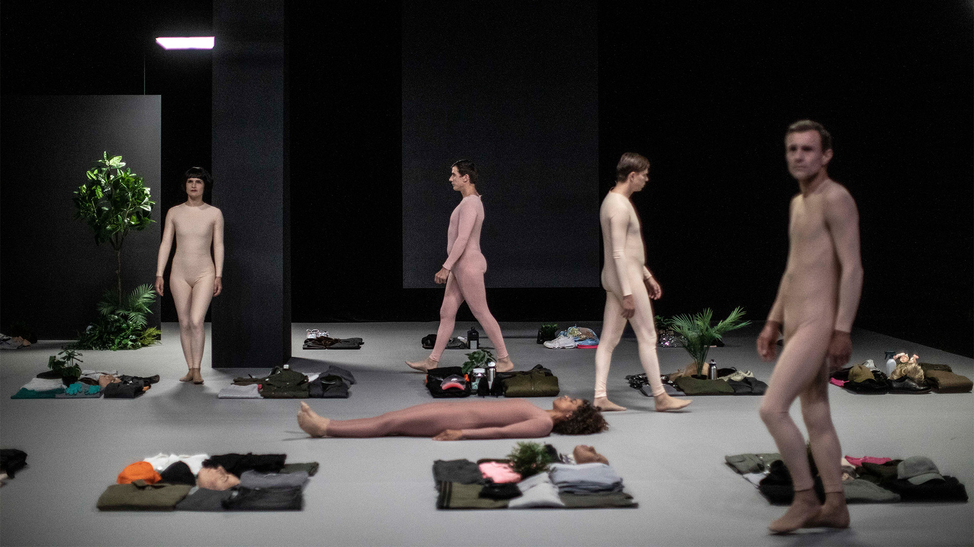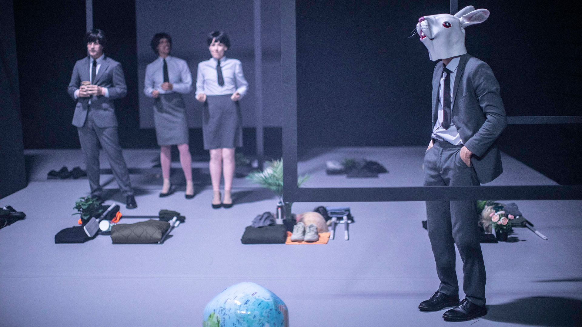 Sur un plateau quasiment nu, des figures anonymes déambulent. Ce sont les habitant·es de « l’âge des nouveautés », une ère dystopique régie par un ordre social implacable et des règles strictes.