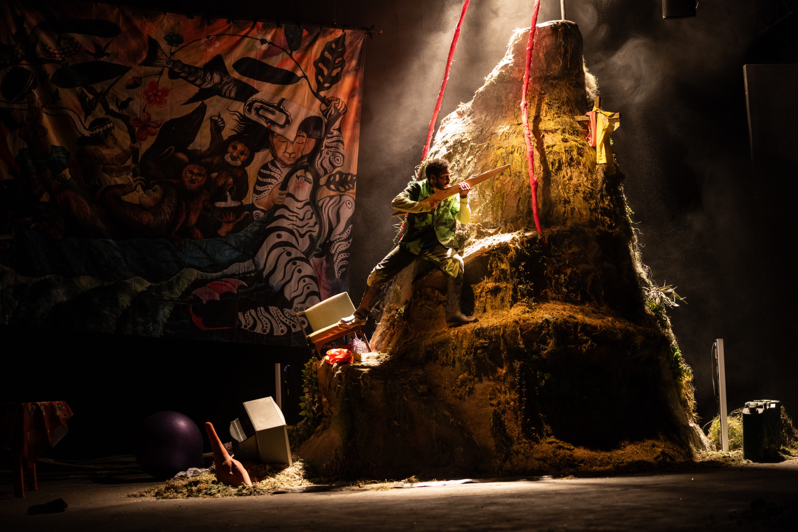Au sein d’une scénographie grandiose et avec un engagement physique total, le duo circassien investit un plateau foisonnant, bigarré et surréaliste, parsemé de symboles de la culture sud-américaine et baigné des sons d’une nature alarmante, pensée comme un terrain de lutte poétique. Ils en conçoivent une œuvre généreuse, tissage composite, qui nous invite, avec poésie et humour, à décoloniser nos esprits, faire acte de résistance et nous ré-ancrer dans la terre.